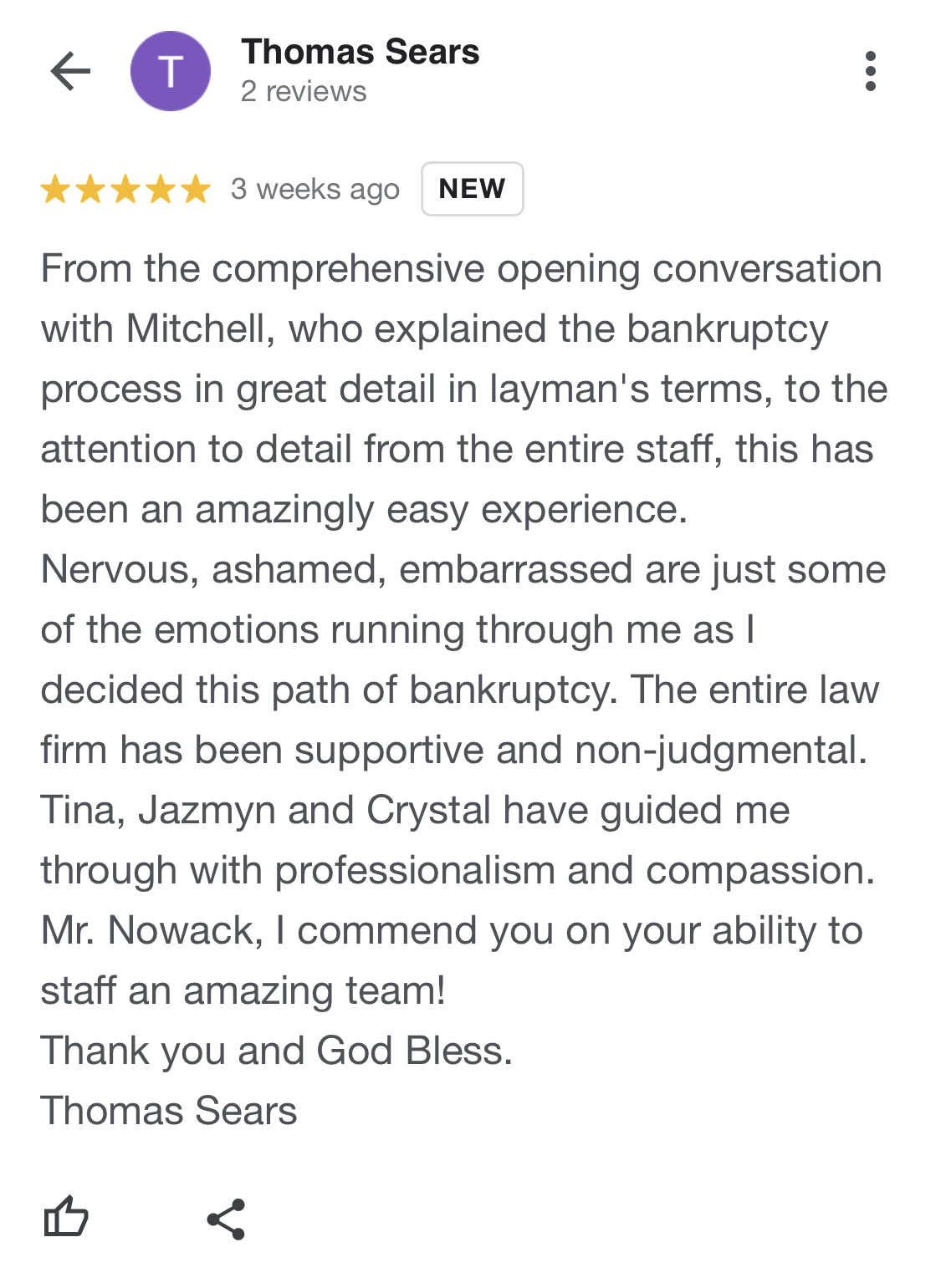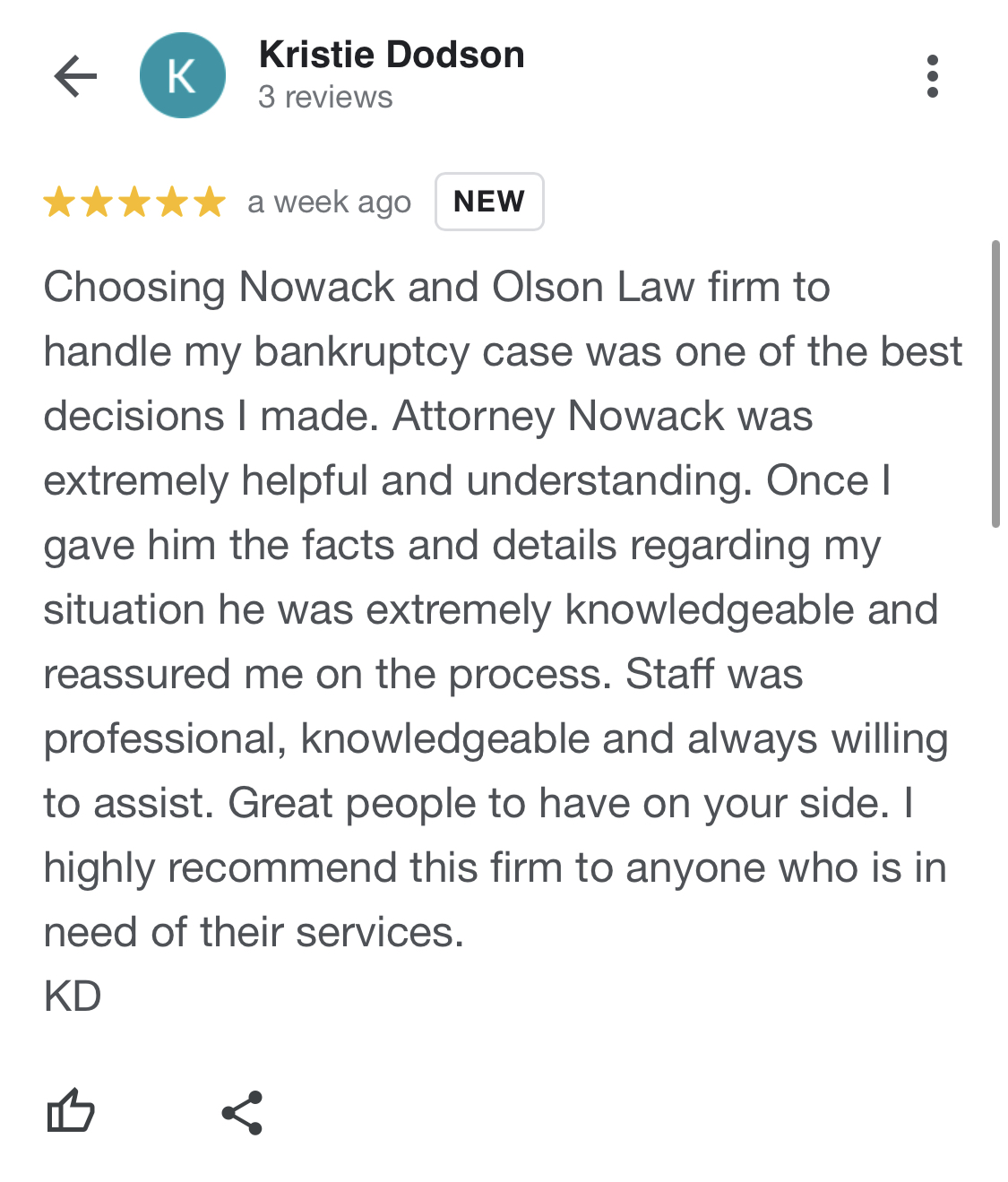 At Nowack & Olson, PLLC, we have helped thousands of individuals and families like you find relief from overwhelming debt and make a fresh start financially. We will help find the best Bankruptcy solution for you, be it Chapter 7 or Chapter 13. Everybody’s needs are different, and we don’t try to push you into one particular choice. We will put you at ease, guide you through the process based on your unique needs and help you overcome this difficult time.
